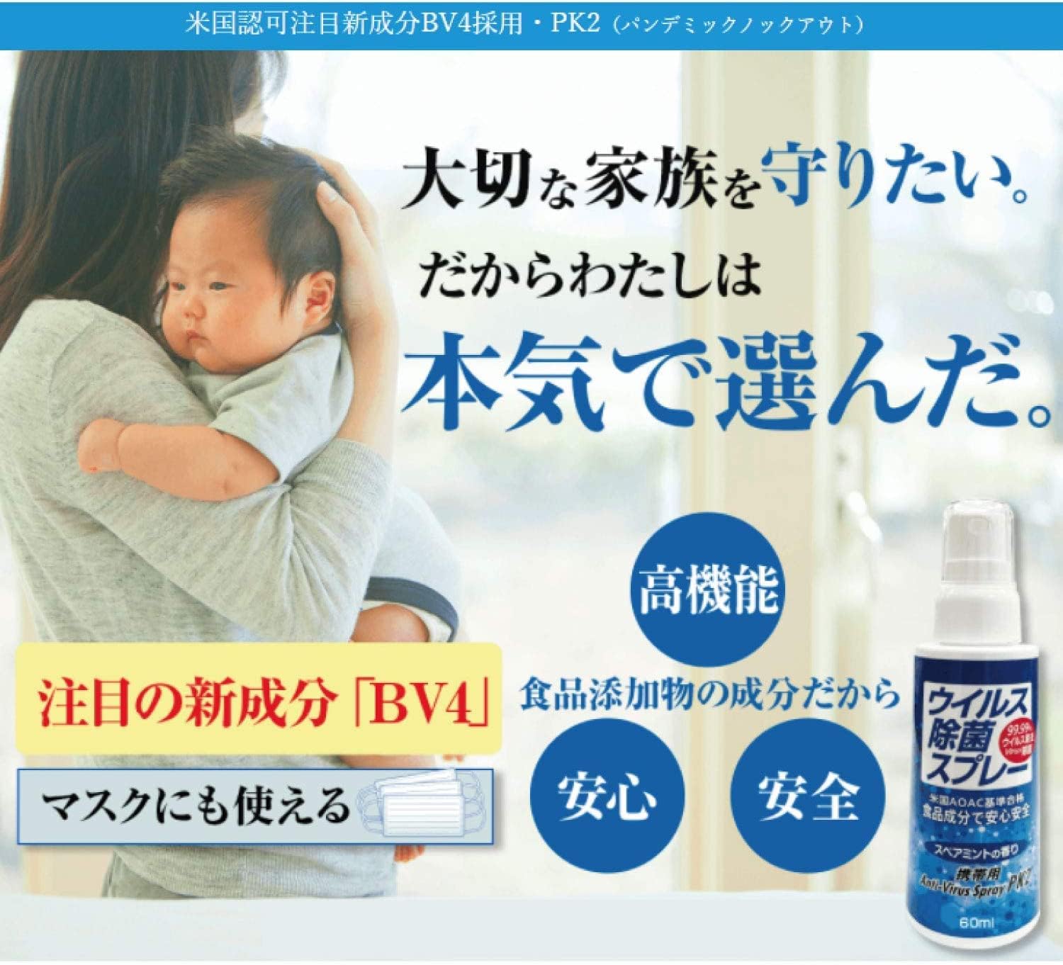 「PK」=Pandemic Knockout(パンデミックノックアウト)「2」= 菌もウイルスもW の効果食品及び食品添加物から 構成された効果と安全性の両立をコンセプトに開発された抗ウイルス・除菌製剤です。※商標登録申請中