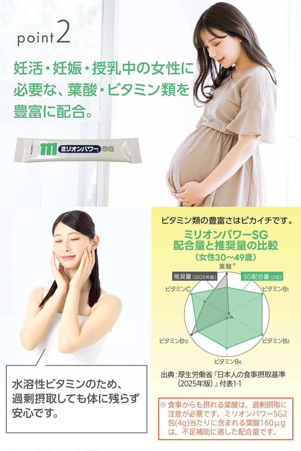 【体に残らず、粉末だから余分な成分を含まない】ミリオンパワーSGに配合されているビタミンは全て水溶性。そのため過剰摂取分は排泄され、身体には残りませんので安心してお飲みいただけます!更にミリオンパワーSGは粉末だから余分な成分が含まれていません!カプセルにはゼラチンや油分などが含まれています。ミリオンパワーSGは粉末ですのでそのような余分な成分が含まれません!