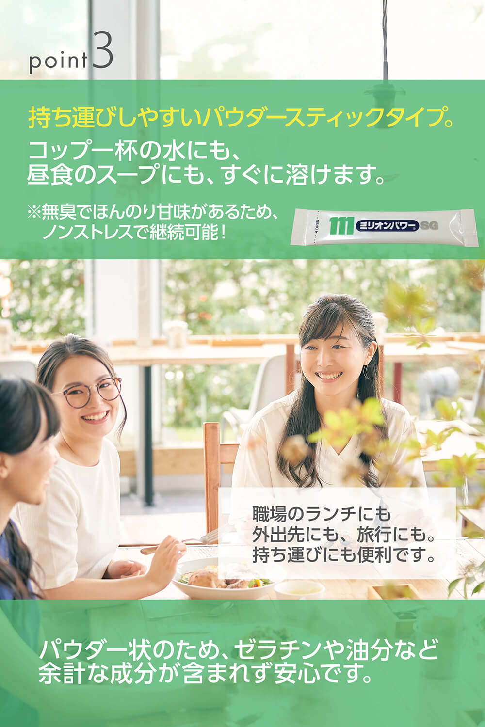 【安心安全】お子様から大人の方まで幅広い方々にお試しいただけます。溶けやすくクセの少ないミリオンパワーSGは介護食に取り入れるのもおススメです!