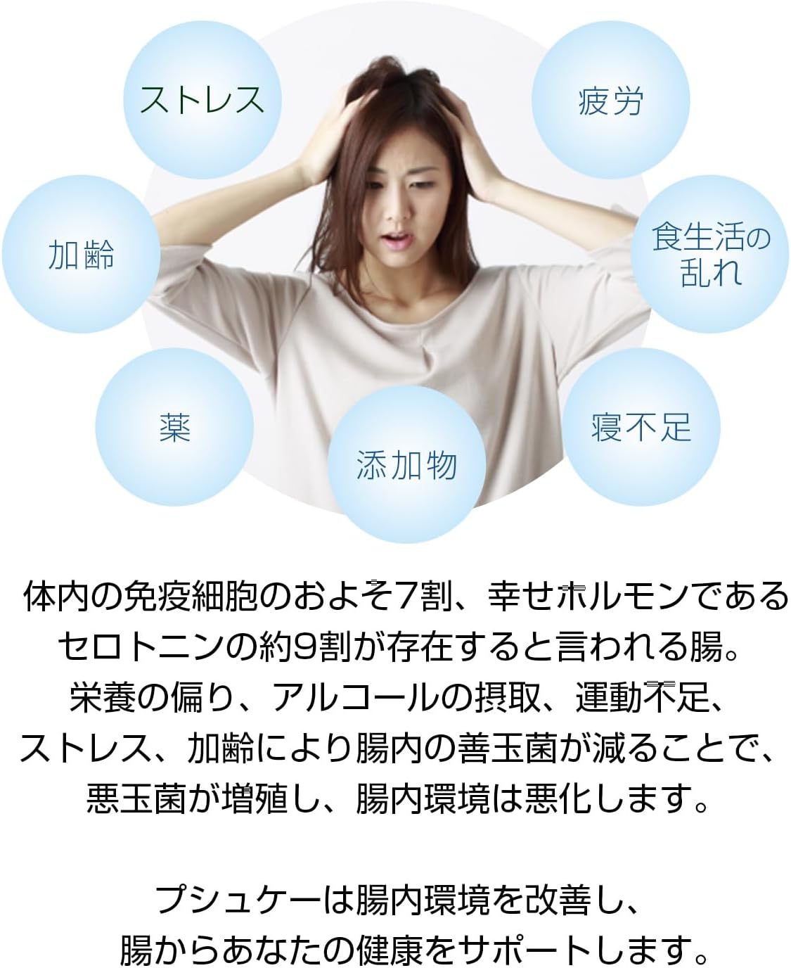 加齢や疲労、食生活の乱れ、寝不足、ストレスなどの生活習慣の影響によって、善玉菌は徐々に減少。 それに伴って、悪玉菌は増殖してしまうのです。